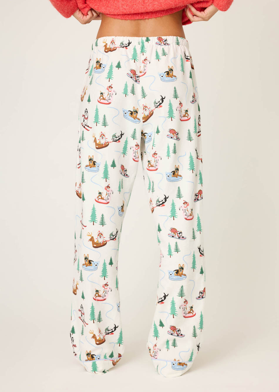 Paw-sitively cozy and snow much fun, these flannel pajama pants are crafted from soft cotton in a classic twill weave. The winter-white backdrop is scattered with playful pups skiing, sledding, and tubing through the trees, finished with a contrast tie waist and piped hems. Perfect for snow days, couch days, and snoozing after all the fun.