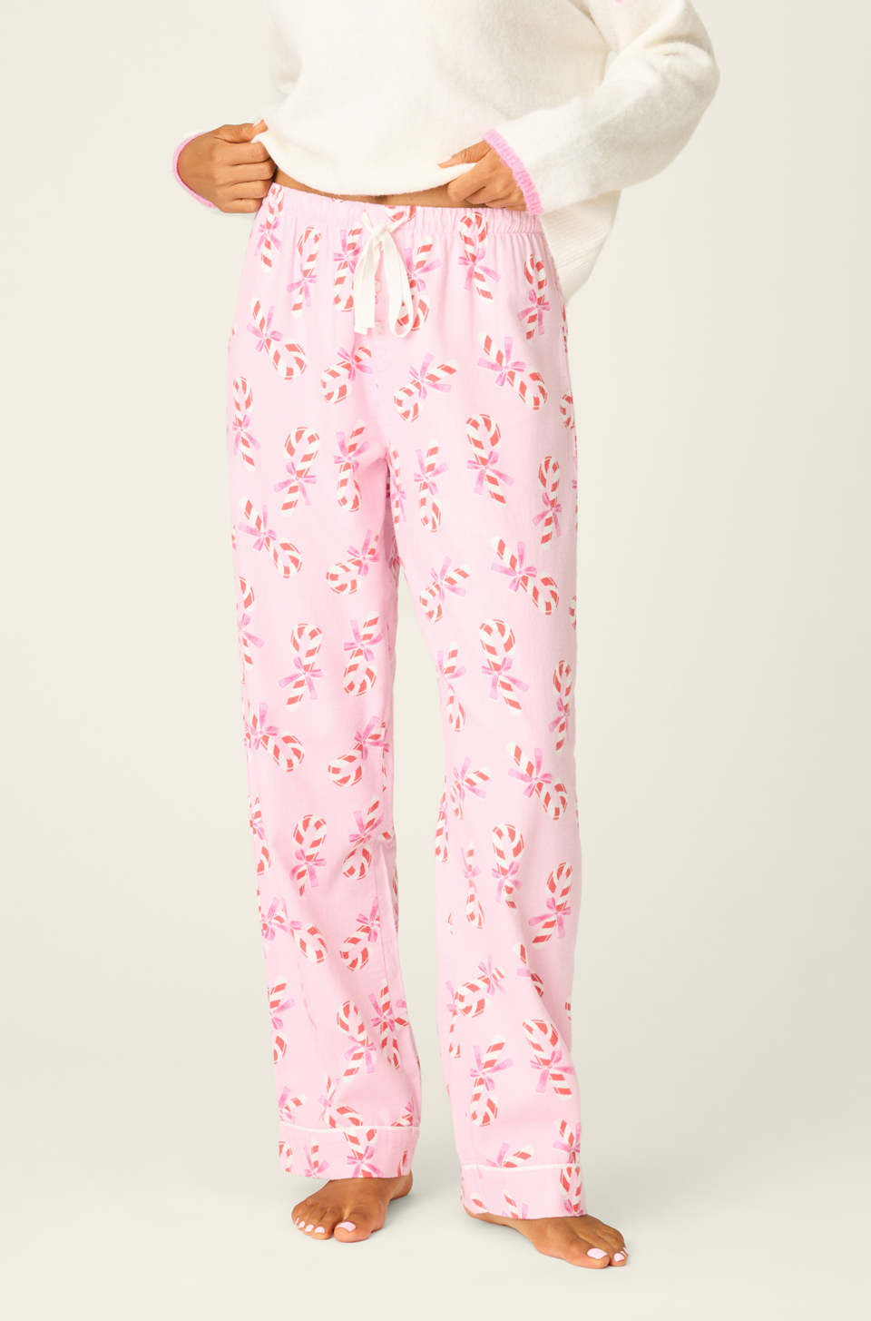 Sweeten your holiday season in these pink cotton flannel pajama pants, covered in candy canes tied up in pink bows. Designed with a relaxed open leg and elastic waistband, they’re a cozy base for family lounging, peppermint cocoa, and movie marathons.