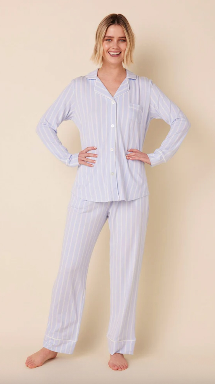 The Cat's Pajamas Women's Heritage Stripe Pima Knit Cotton Classic Pajama Set in Blue