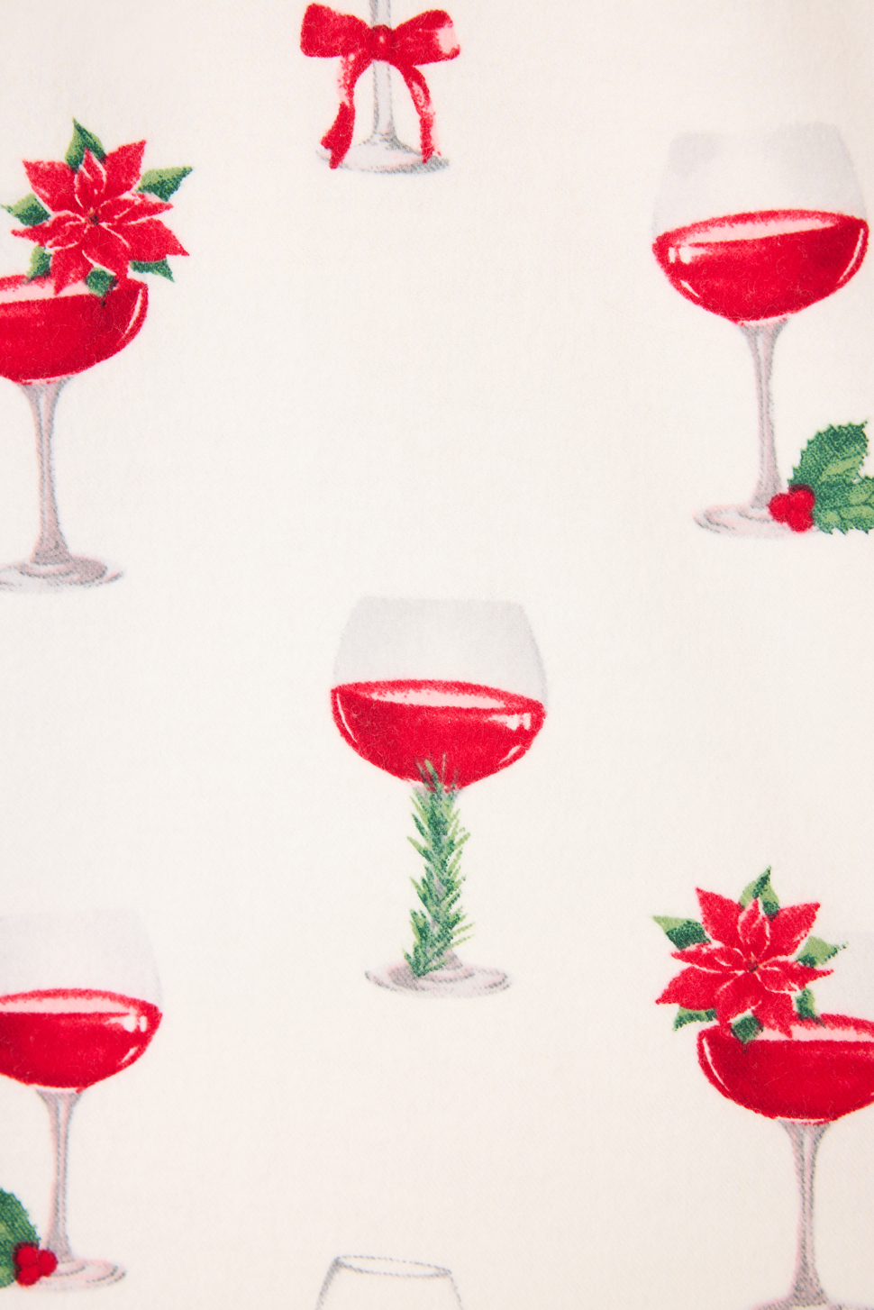 • Women’s plus size ivory cotton flannel 3-piece pajama set with holiday wine glass and poinsettia print, button-down top with red piping, relaxed drawstring pants, and matching headband.